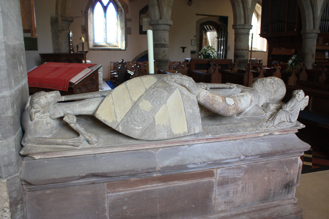 Re-set mid-C14 altar tomb with big effigy of Sir Richard Pembrugge in armour with a dog at his feet and angels at his head.