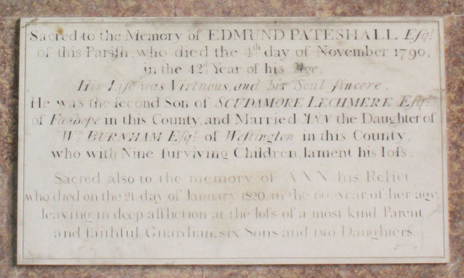 The impressive memorial to Thomas Pateshall who died in 1790 and to his wife Ann who outlived him by over 29 years.